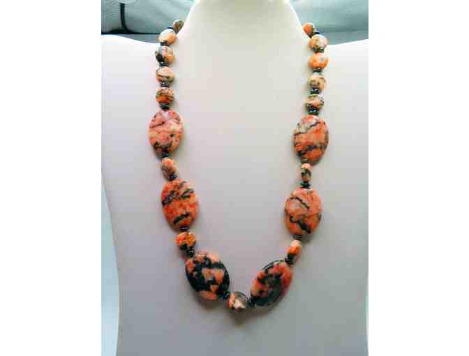 Necklace measures 9 inches long with pink zebra hematite accents and bronze clasp.