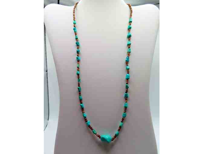 Necklace measures 11 1/2 inches long with shell toned and turquoise details and bronze clasp.