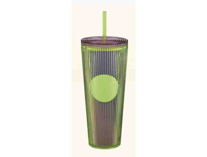 Refreshing crisp green plastic double-wall cold cup and a reusable straw.