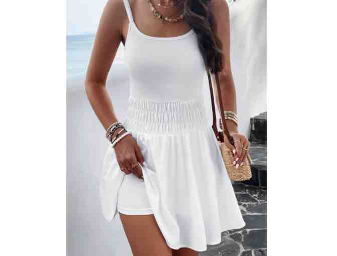 Make a splash this summer in this cute sundress by Beachsissi. Ribbed tee and ruched waist add sytle and flair. Size large. Made of polyester.