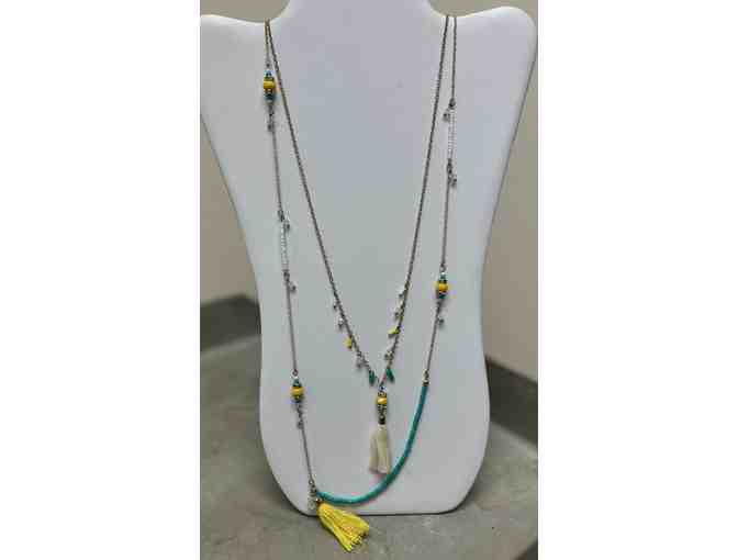 Elevate your accessory game with this stunning layered blue and yellow necklace from Premier Designs. Featuring a vibrant blend of bold blues and sunny yellow accents, this piece is perfect for adding a cheerful statement to any outfit — whether you're dressing up a classic white tee or completing your evening look.