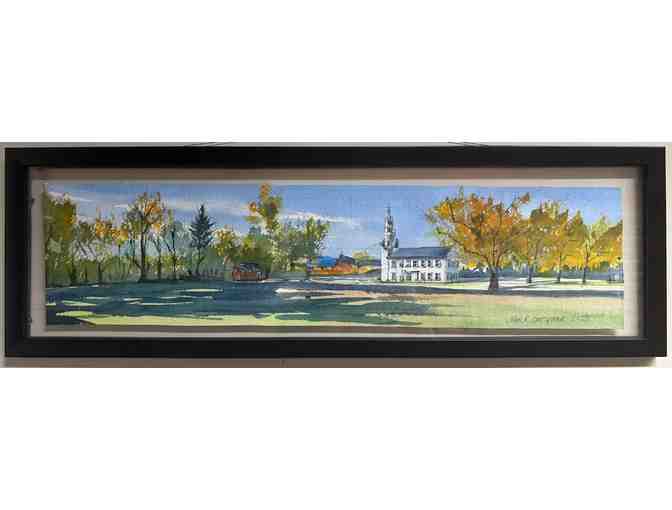 This original artwork of the Jaffrey Meetinghouse by John Grosvenor is a true conversation piece! The architectural training of the artist is evident in this panoramic view of the meetinghouse in autumn. The frame measures 9" x 28".