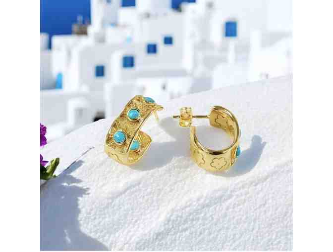 The design is brought to life by authentic turquoise gemstones, their vibrant azure tones echoing the crystal-clear waters of the Aegean Sea, a nod to the sun-drenched vistas of Santorini. Each turquoise stone is carefully set against an intricate filigree pattern, inspired by the radiant rays of the sun. This meticulous detailing creates a luminous interplay of texture and light, capturing the essence of sunlit mornings on a Grecian island.