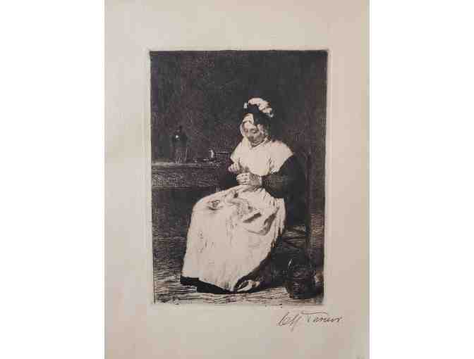 Etching by C.Y. Turner, 1850-1919, American. Titled A Pinch of Snuff, 1886. Signed in lower right corner "CY.Turner" outside the plate mark.