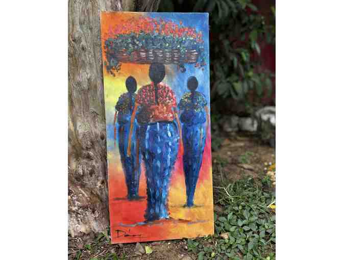 This stunning original painting by Diaz. Captures the vibrant spirit of Guatemala through the graceful movement of three Guatemalan women walking, dressed in traditional attire. The rich colors and textured brushstrokes bring the scene to life, making it a powerful tribute to everyday beauty and culture.