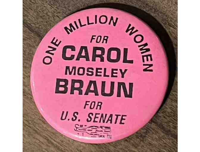 A pink round button from the 1992 campaign of Senator Carol Moseley Braun. Button is in good condition,