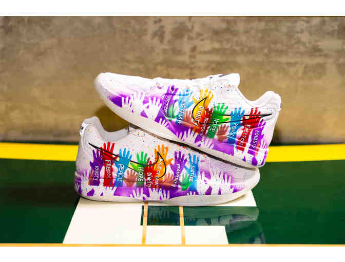 Shoes will be worn during WNBA game on August 1st vs. Los Angeles Sparks and autophraphed postgame. Shoes are size 11.5 Nike JA 2s. Custom sneakers designed and hand painted by artist Takiyah Ward at Re-Sole 206.