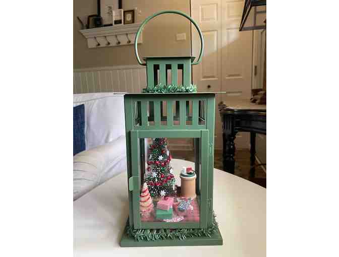 Add this cute miniature scene to your holiday décor this year. Handmade by Stephanie Moore it features a cute green lantern with a Christmas tree and decorations inside.