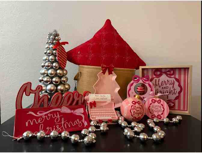 Pink Bow theme any girl would love! Includes 12 items -Several decor signs, trays and ornaments. Throw pillow, mini type writer, silver ball mini silver tree and silver ball mini garland. Basket included.