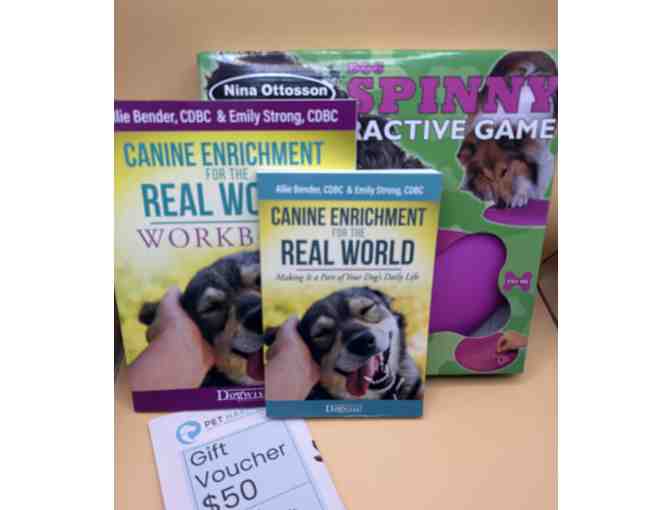 This auction lot includes signed copies of "Canine Enrichment for the Real World" book and workbook from author Allie Bender. Also included is a $50 certificate for a training session in person or remotely, and a fun interactive game for your pup!
