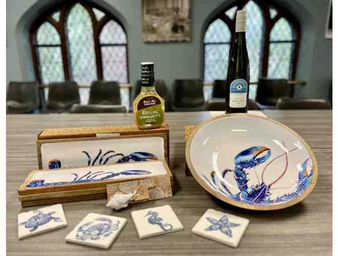 Nestled inside are the necessities to host the perfect outdoor gathering - blue lobster salad bowl and matching platters, seashell cheese knife and sea creature ceramic coasters. Anchored by a bottle of Heron Hill Reisling and a bottle of Bully Hill Vineyard Riesling Vinaigrette