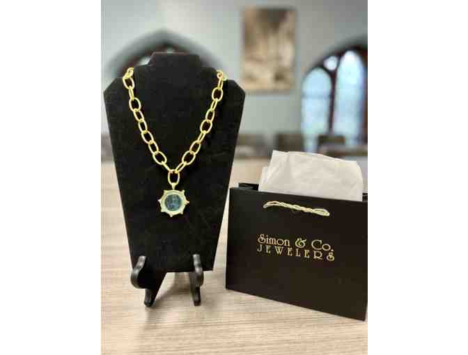 Gold-plated, high fashion aqua medallion on a large, round-link chain. Made in France. Purchased at a jewelry show in Europe.