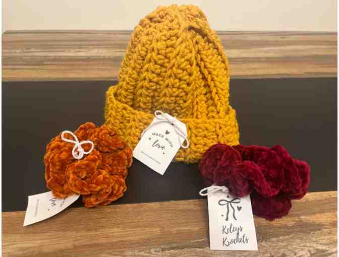 Hand crocheted beanie and 2 scrunchie set made by Kelcys Krochets