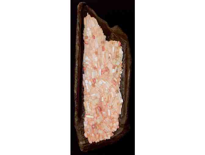 "Immortality" by Dee Ruff is a lightweight sculpture is completely handmade. It features a variety of hand cut glass and iridescent glass tesserae, and a genuine liquid iron coating that has been oxidized and sealed with an industrial metal sealer.