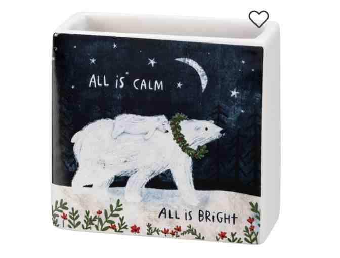 A double-sided square stoneware vase featuring a baby polar bear sleeping on a polar bear wearing a wreath, night sky, snow-covered ground, and floral designs with "All Is Calm All Is Bright" sentiment. Sides feature coordinating white design. Our All Is Calm square vase is perfect for displaying florals and other items. This house plant home decor makes a great addition to any space.