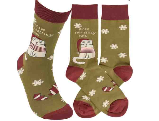 A pair of colorful woven socks from our Holiday Pet Collection displaying a sassy cat in a Santa hat and broken ornament with a fun pet-themed sentiment that reads "Feliz Naughty Cat." Seasonal socks feature a one size fits most design made with cotton, nylon, and spandex.