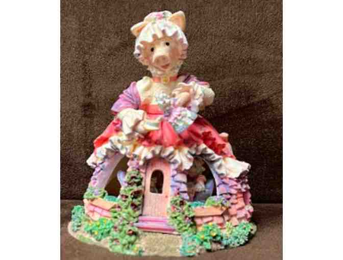 "Ophelia — Tea for Three" depicts a mother pig dressed in a flowing shawl pouring a cup of tea. The cottage beneath her skirt holds two more pigs, drinking tea and gossiping. "She tried to perfect the art and ritual of the Housemother Tea Ceremony."