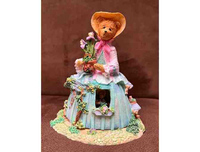 "Kate — The Gardener" depicts a bear dressed in blue and white holding a pot of flowers. Her skirt forms the dwelling, and another bear inside holds a watering can. "She made new magic bloom in the garden in a way it had never bloomed before."