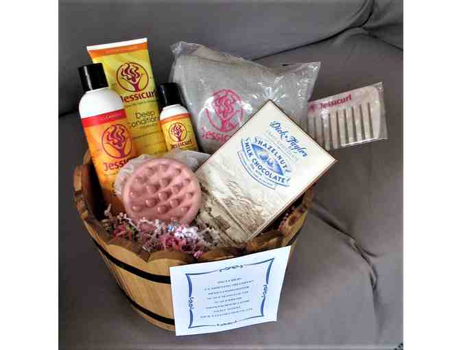 Locally made Jessicurl Rich and Radiant Curly Hair Gift Basket. Pamper your curls with this luxurious collection! The Rich and Radiant Collection "is best suited for thicker, drier curl types that are looking for curl enhancement and moisture."