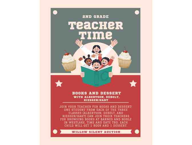 Join your teacher for books and dessert! One student from each of the three Classes (Albertson, Debolt, and Riessen/Hart) can join their teachers for browsing books at Barnes and Noble in Westlake. Time and Date TBD. Each child will get 1 book and 1 dessert.