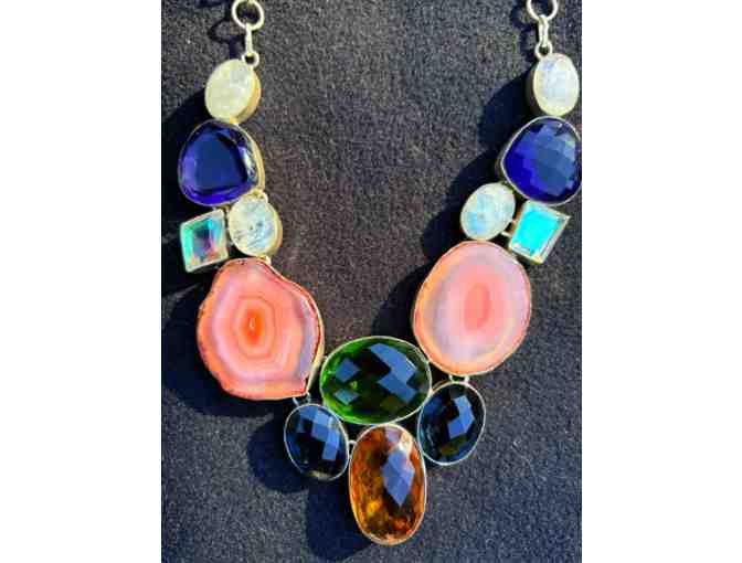 All these beautiful stones are set in stirling silver, (925) stamped in the silver but sometimes the stamps are not valid. It is a lovely piece that would look beautiful for an evening outfit or to dress up a more casual look. Made in India.