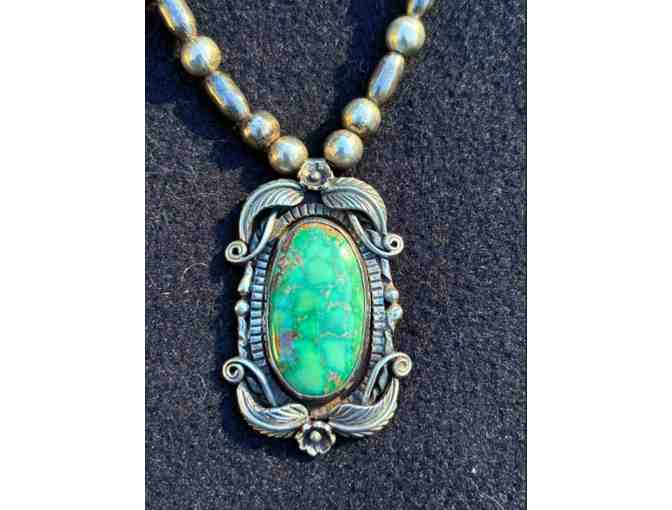 This necklace has silver round and elonated bench made beads. There are beautifully subtle stamp marks on the long beads and the stone setting is unique and elaborate. This necklace is an investment and will hold its value based on the maker.