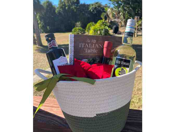 This Basket starts with Italian Wine, Balsamic vinegar, Olive oil, and At My Italian Table cookbook by Laura Vitale!   Everything you need to make a Great Meal!  PLUS, a Nora Fleming Chip and Dip Tray!   Bid Bid Bid!