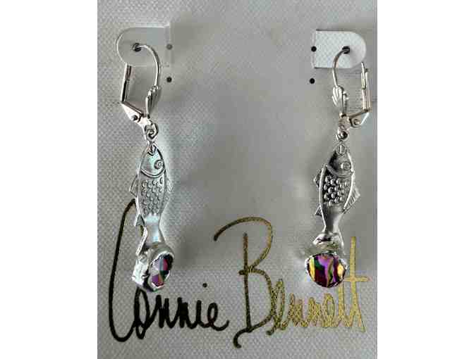 You are bidding on a beautiful pair of earrings with fish and glass.  The fused glass transmits one color and reflects another color.  The design is original, conversational and easy to care for.